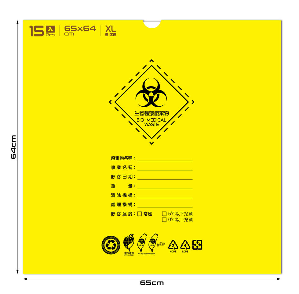 全台首家通過環保標章綠色採購的 100% 回收塑膠材料製造的感染性廢棄物袋,從原料到製程皆以環保永續為核心,兼顧醫療安全與低碳環保,讓每一個醫療用袋,都成為推動環境與醫療永續的起點。
